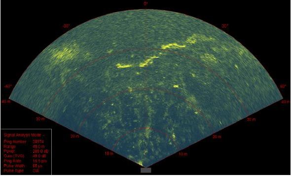 A cloudy/speckled substance occasionally appeared on the SeaBat interface. Its density varied, and the location of it often corresponded with shark sightings. This substance may be the plankton that the sharks feed on (Figure 14).​