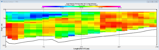 Figure 3: Plot of the vertical variation of the velocity direction across the length of the transect with near surface currents directed to the north east (blue) with an abrupt vertical shear at a depth of 10 meters with the deeper currents north west (Red) near the bottom at the beginning of the transect and a frontal boundary at a length of ~1700 meters in the transect where the water column is well mixed and flowing to the north west.